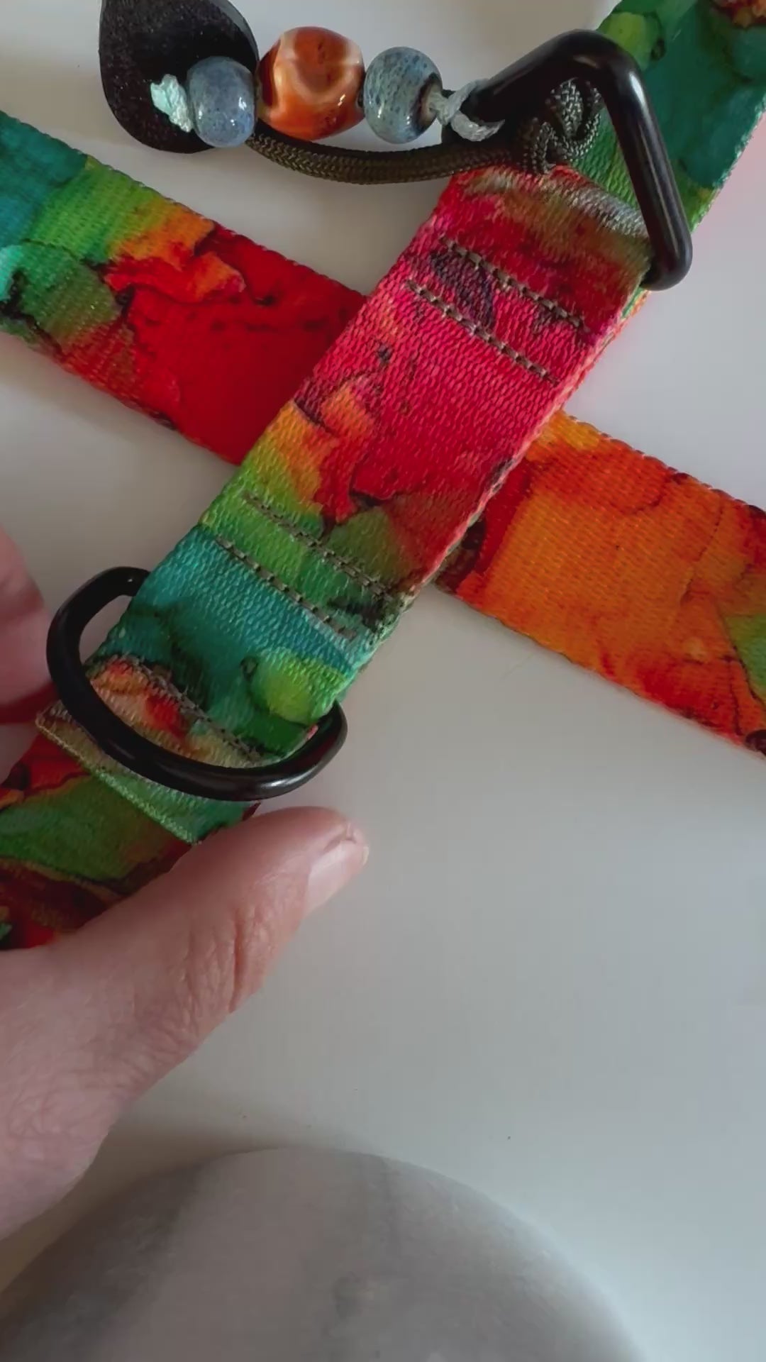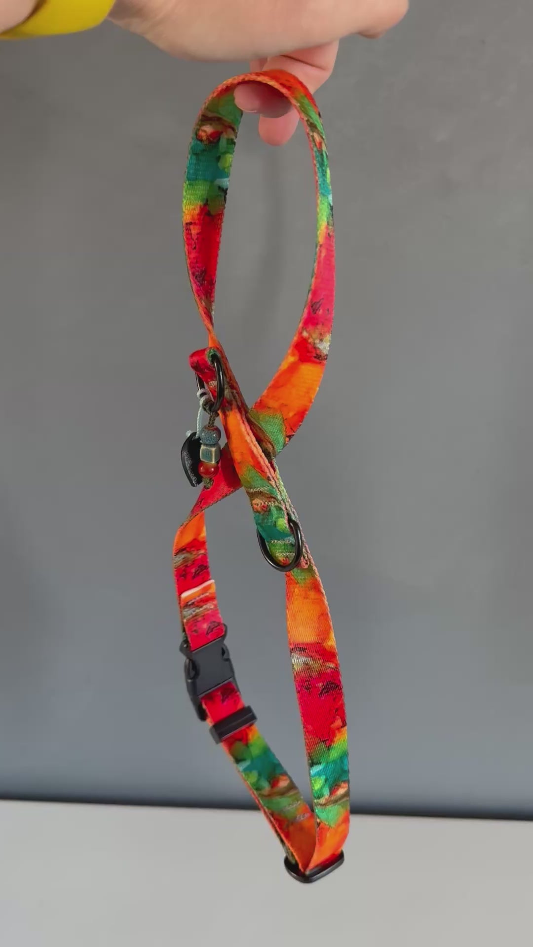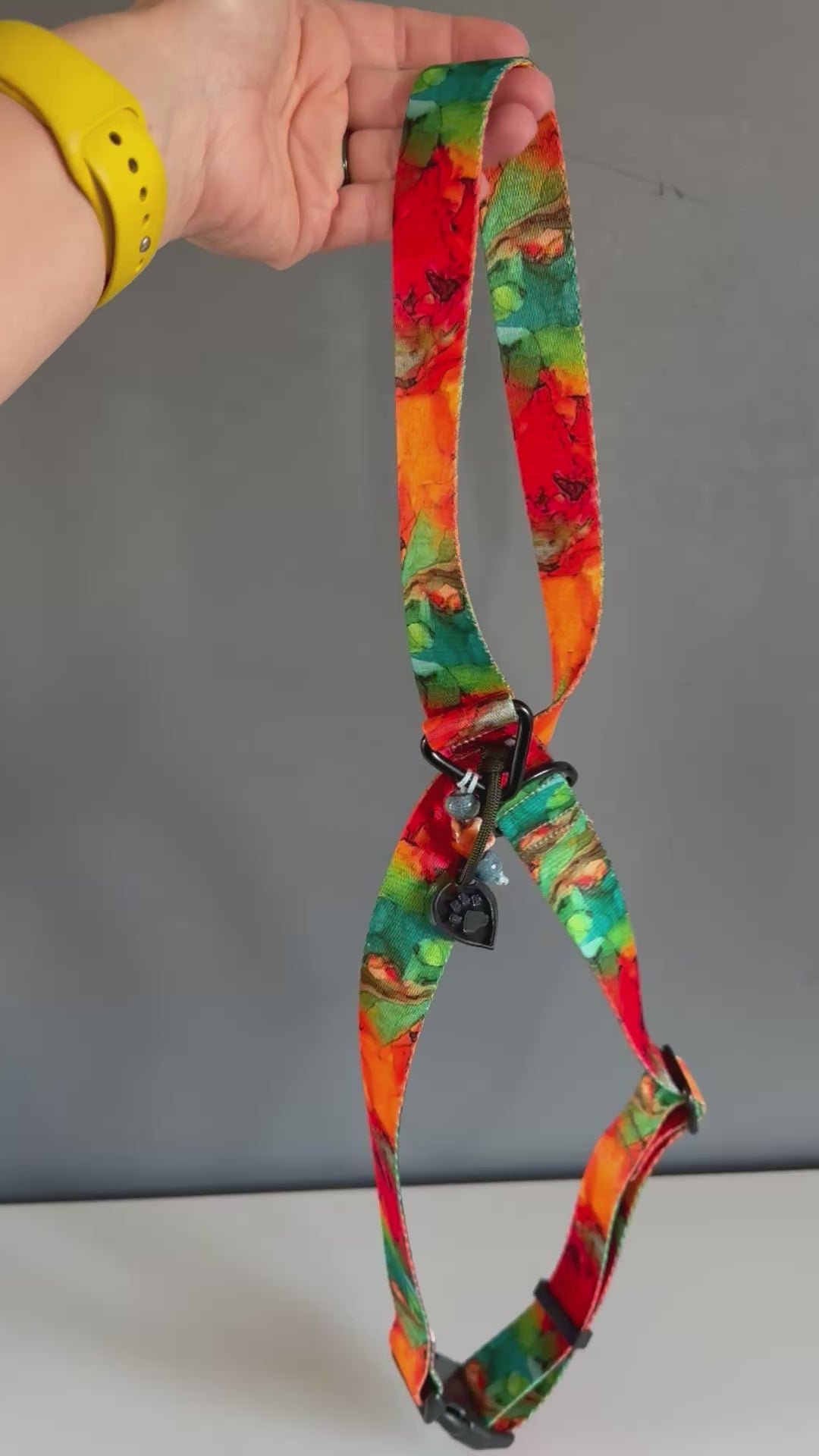 The section over the withers (where the webbing crosses) is sliding and adjustable, allowing the straps to move with the dog’s body.